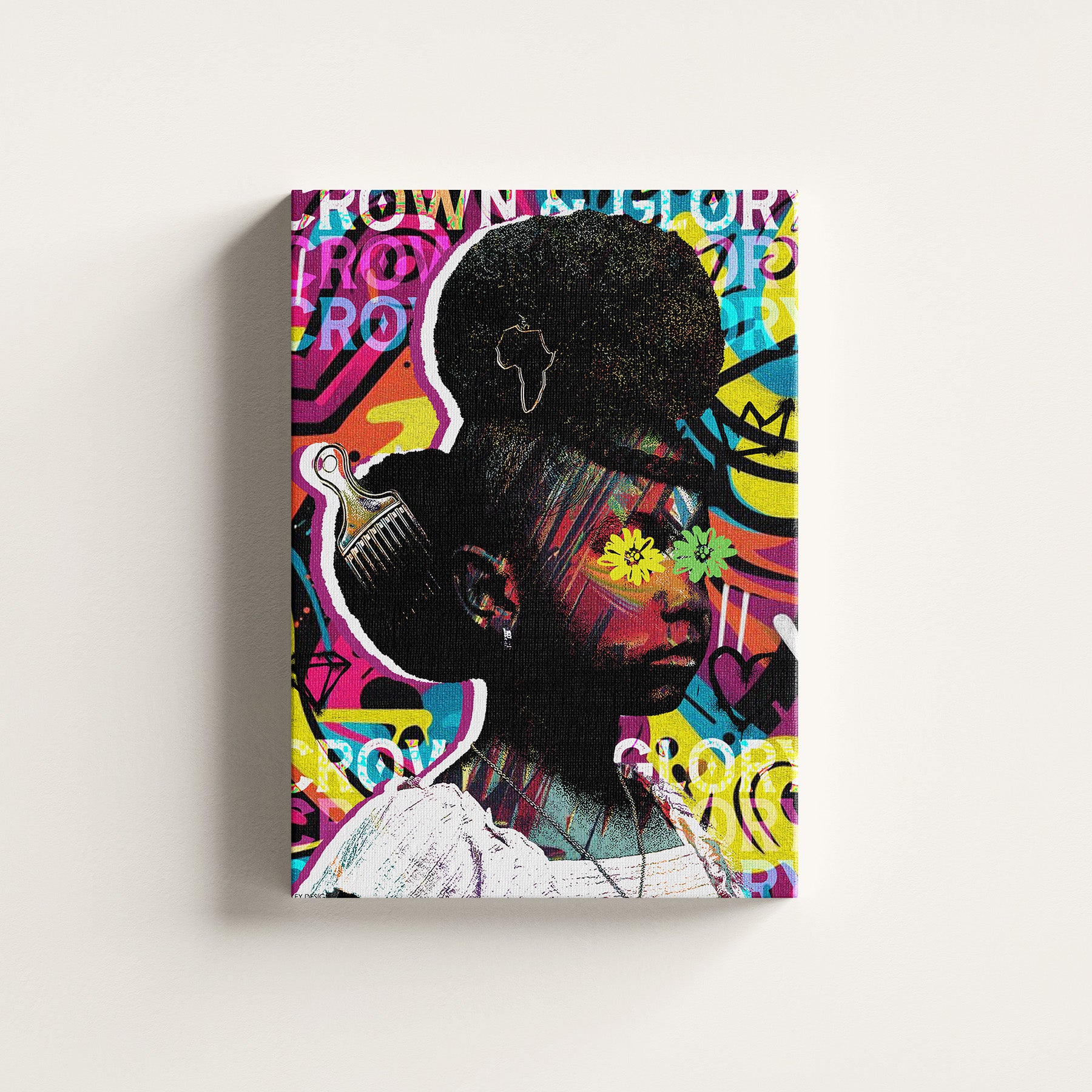Experience the exquisite charm of our digital masterpiece, paying homage to the lavish elegance of afro-textured hair. This artwork is meticulously replicated on a stunning 18" x 24" canvas, featuring a seamless wrap around border for a perfect presentation.