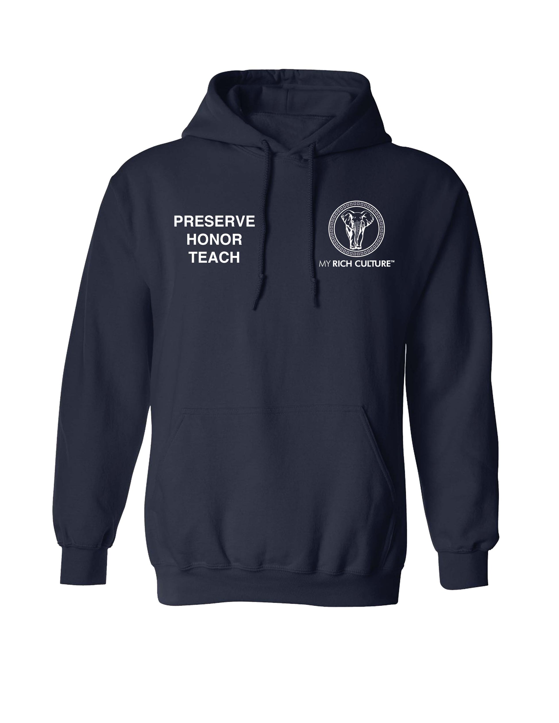 Presenting THE MOTTO - a cozy, and gender-neutral hoodie that delivers a strong message. Our symbol logo, the African Elephant, is boldly featured on the front with the words Preserve, Honor, and Teach, while the back displays our brand name for a contemporary look that will surely garner admiration. Embody an inspirational statement with THE MOTTO!